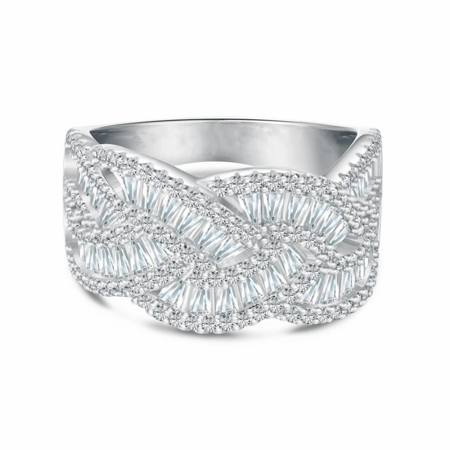 The Baguette Diamond Braided Ring by Sissi Jewellery showcases our expertise in selecting premium man-made diamonds with a brilliant sparkle rivaling genuine diamonds. Crafted in 925 sterling silver, triple-layered with White gold plating, the ring is both hypoallergenic and tarnish-resistant for long-lasting elegance.